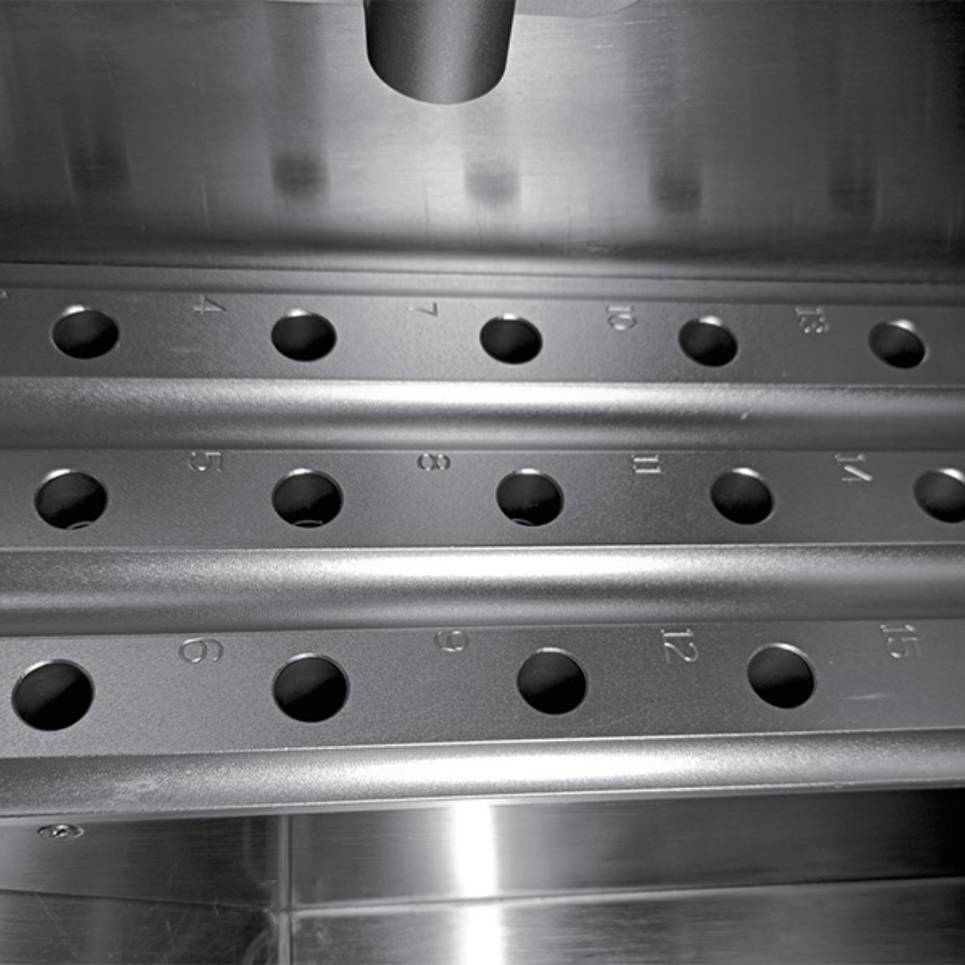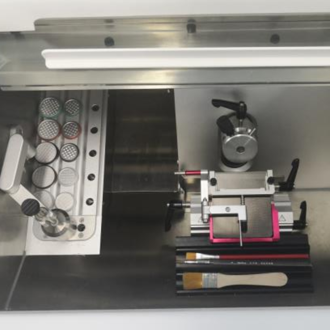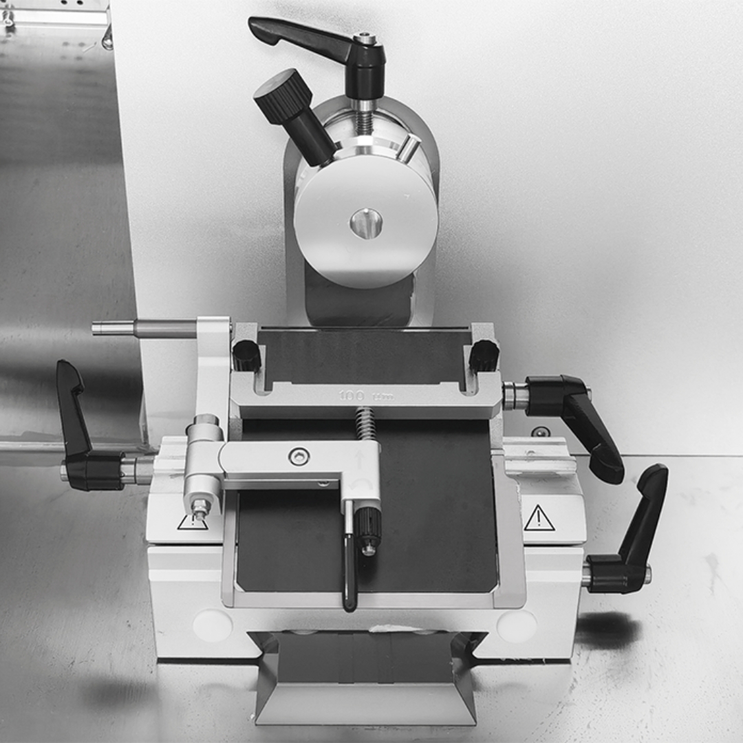 câmara extragrande para até 20 discos de amostra com bandeja de resíduos e suporte de instrumentos