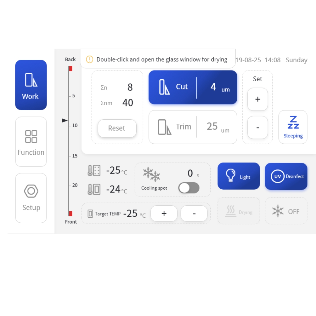 Possui sistema de controle modular por tela Touch ou Joystick, hibernação automática/manual, ativar em 15 min, esterilização UV, Número da seção e cálculo da espessura.